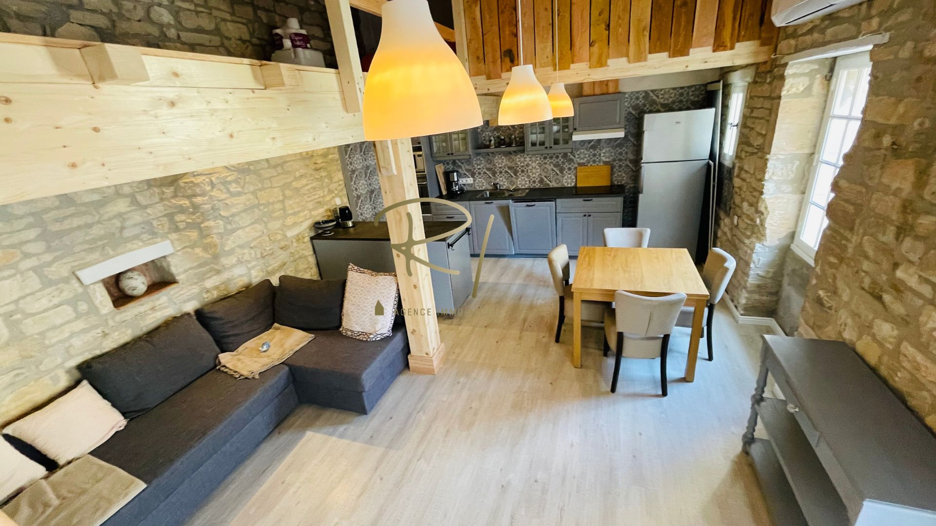 Par un escalier extérieur, accédez au premier étage et laissez-vous charmer par une belle terrasse exposée plein sud, baignée de lumière. Elle ouvre sur la seconde partie de l’habitation, une superbe pièce de vie lumineuse avec cuisine équipée, climatisation réversible pour un confort en toute saison, et une mezzanine offrant un espace nuit mansardé.