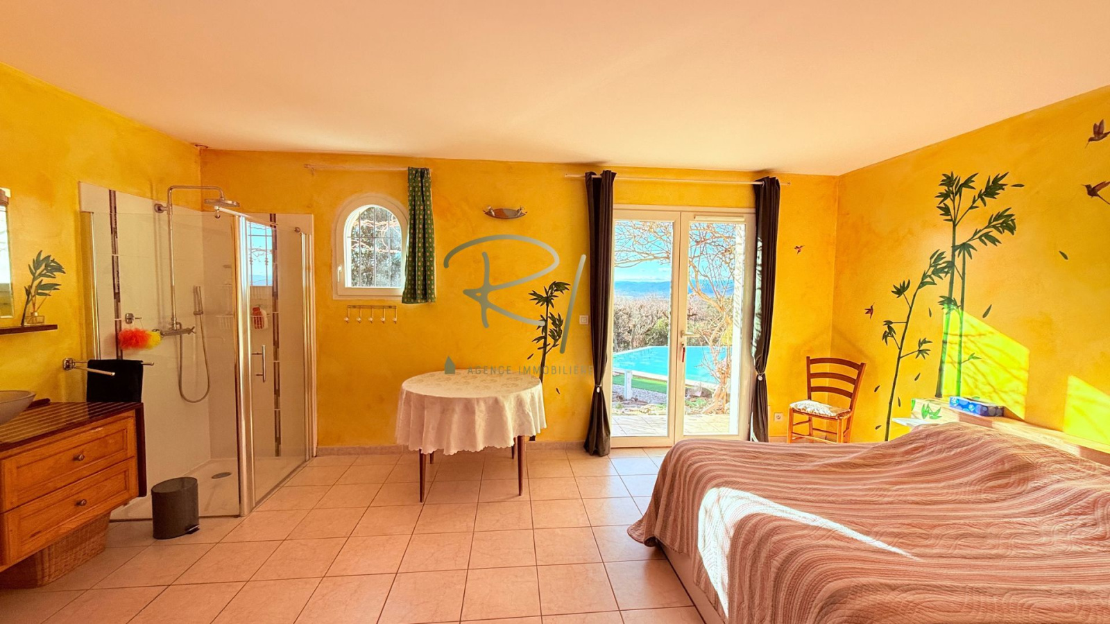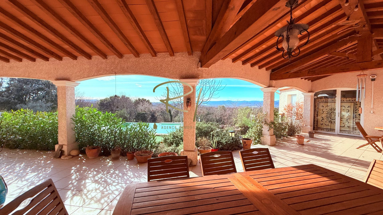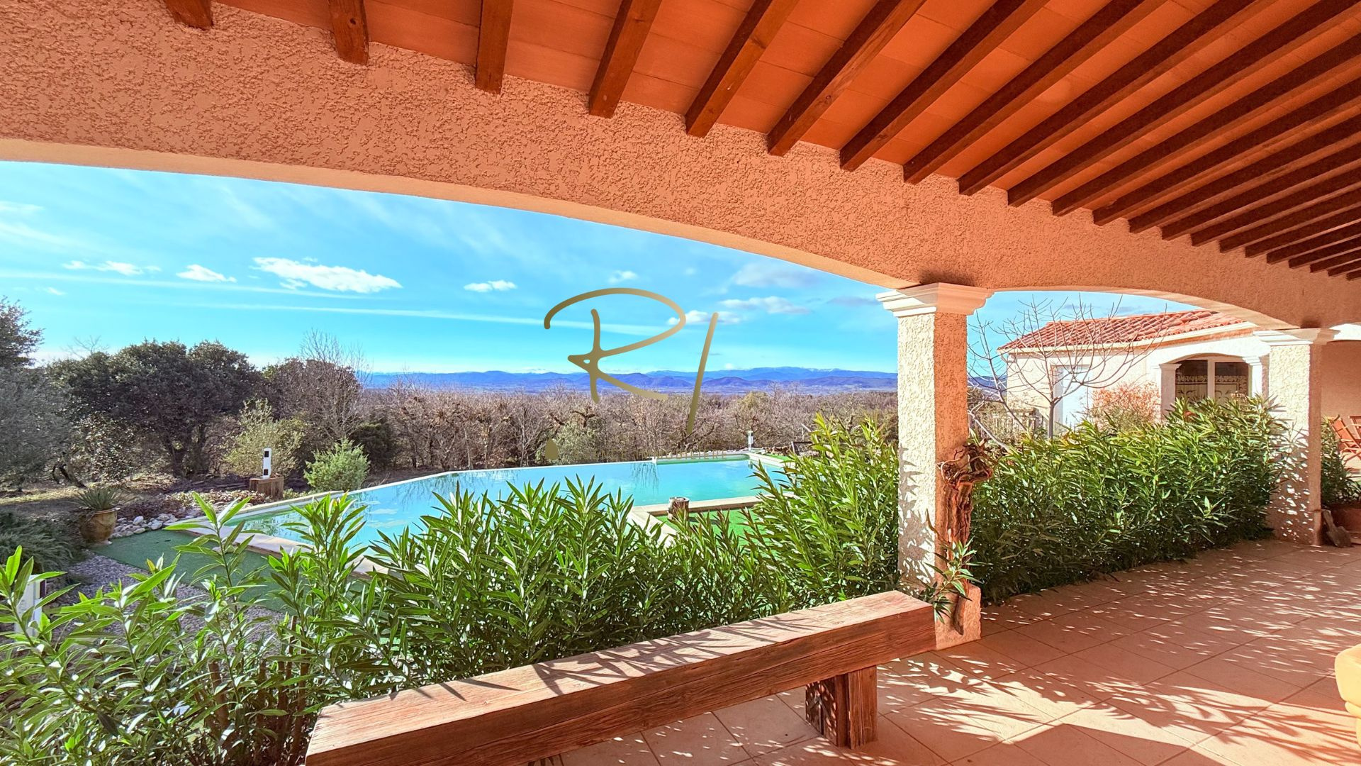 L’extérieur, soigneusement aménagé, accueille une magnifique piscine à débordement, véritable invitation à la détente, ainsi qu’un vaste espace terrasse couvert, parfait pour des moments de convivialité en toute saison.