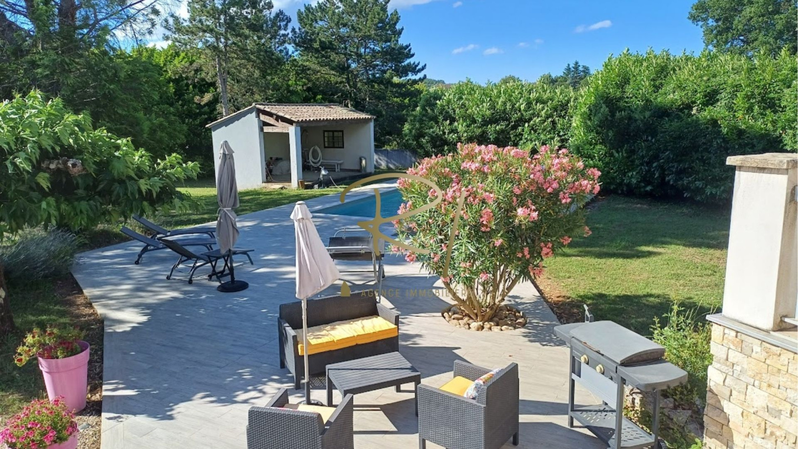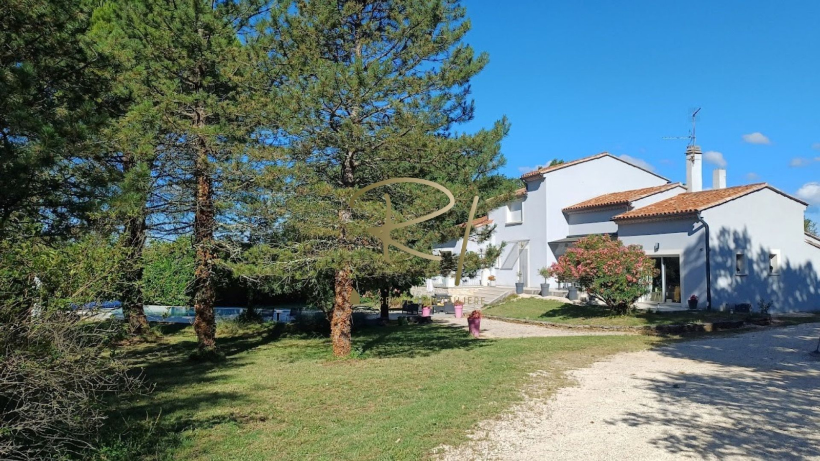 Édifiée sur un superbe terrain de 3 177 m², planté de pins et d’oliviers, la maison bénéficie d’un extérieur soigné avec une grande piscine de 10 x 5 mètres, idéale pour les beaux jours.