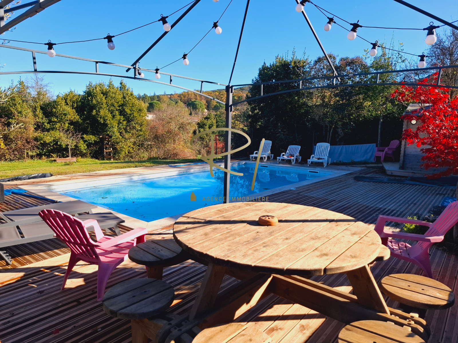 Les espaces extérieurs, agrémentés d’une piscine avec spa intégré et cascade offrent un cadre relaxant propice au repos et à la convivialité.